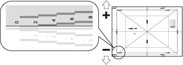 Berühren Sie diese Taste, wenn die Mittellinie der Registermarke innerhalb der Kante der Testseite liegt. Das Bild wird, von der Zufuhrrichtung des Papiers aus gesehen, um die Zahl der eingegebenen Pixel nach vorne verschoben.