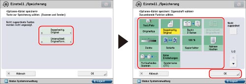 Berühren Sie eine Kurzwahltaste → Wählen Sie die Einstellung, die unter der Taste gespeichert werden soll → Bestätigen Sie durch Berühren der Taste [OK].