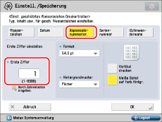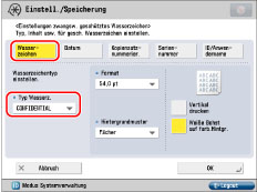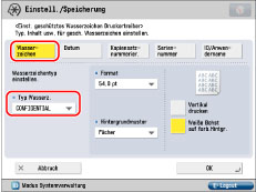 Nähere Informationen zum Eingeben von Zeichen finden Sie im Abschnitt "Zeicheneingabe über das Sensordisplay". Wenn Sie in [Zeichen für Seitennum./Wasserz. speichern] in [Einstellungen Funktion] (Einstellungen/Speicherung) Zeichen registriert haben, können Sie die Zeichen aus der Liste auswählen.