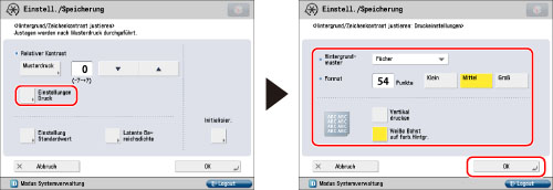 In der Grundeinstellung ist [Weiße Bchst auf farb.Hintgr.] auf dem Display <Einstellungen Druck> für das Erstellen von Musterdrucken nicht ausgewählt. Wenn [Weiße Bchst auf farb.Hintgr.] aktiviert ist, regeln Sie mit [Einstellung Standardwert] die Dichte des Texts und mit [Latente Bereichsdichte] die Dichte des Hintergrunds.
