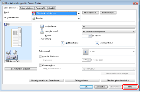 Sie können sich die Online-Hilfe durch Anklicken der Taste [Hilfe] des Druckertreiber-Bildschirms anzeigen lassen.