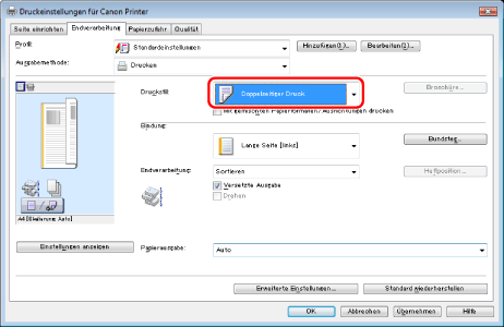 Die Standardeinstellung für [Druckstil] ist [Doppelseitiger Druck]. Sie können die Standardeinstellung auch in [Einseitendruck] ändern. Die Anleitung zum Ändern der Standardeinstellungen finden Sie unter "Konfigurieren der Standard-Druckeinstellungen".