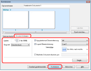 Wenn Sie die Druckeinstellungen der zusammengefassten Datei bearbeiten möchten, klicken Sie auf [Druckeinstellungen] → Definieren Sie die gewünschten Einstellungen → Klicken Sie auf [Kombinieren].
