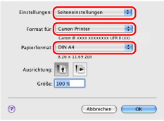 Je nach verwendeter Anwendung wird das Dialogfenster [Papierformat] unter Mac OS X 10.5 oder höher möglicherweise nicht angezeigt. Wenn dies der Fall ist, können Sie die folgenden Einstellungen aus dem Dialogfenster [Papierformat] festlegen. Dieses erreichen Sie, indem Sie im Menü [Ablage] die Option [Drucken] auswählen.