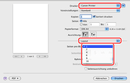 Wählen Sie den Drucker aus → [Layout] → Wählen Sie die Anzahl der Seiten, die Sie auf ein Blatt Papier drucken möchten, unter [Seiten pro Blatt] aus.