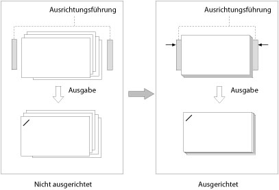 Das kopierte oder bedruckte Papier kann aufgrund von Temperatur, Luftfeuchtigkeit oder Eigenschaften des Papiertyps schrumpfen. In diesem Fall erlaubt es dieser Modus, die kopierten oder bedruckten Papiere auszurichten, indem die Position der Ausrichtungsführung im Finisher justiert wird, um die ausgerichteten Papiere zu heften.