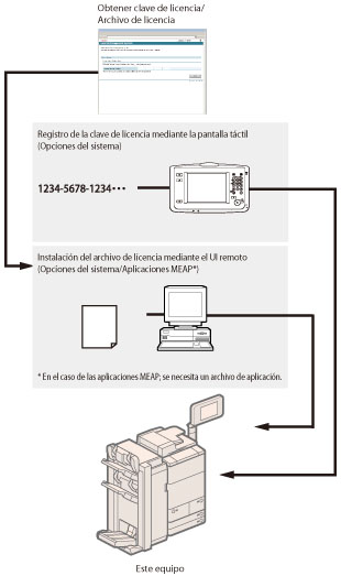 http://canon.com/fau/downloads Cuando descargue los manuales y el software asociado de las opciones de sistema/aplicaciones MEAP, prepare el certificado del número de acceso de la licencia que forma parte del paquete.