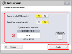 Pulse [Sí] para imprimir automáticamente el informe de actividad cuando el número de transmisiones de envío y recepción llegue a 40.