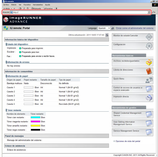Inicie el navegador web → introduzca la dirección IP del equipo en la barra de direcciones.