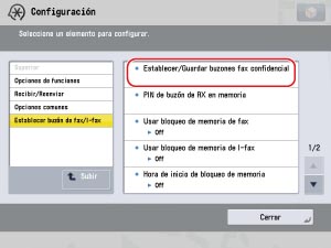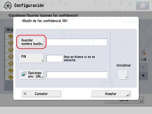 → [Opciones de funciones] → [Recepción/Reenvío] → [Opciones comunes] → [Establecer buzón de fax/I-fax] → [Establecer/Guardar buzones fax confidencial].