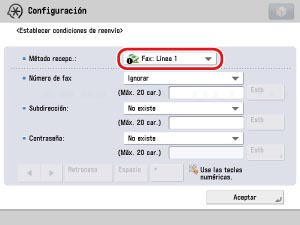 Pulse [Condiciones] → seleccione [Fax: Línea 1] como método de recepción.