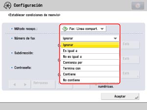 Seleccione [Fax: Línea compart.] de la lista desplegable <Método recepc.:> → seleccione [Es igual a] de la lista desplegable <Número de fax>.