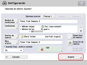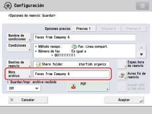 Pulse [Nombre de condiciones] → introduzca 'Faxes desde la Compañía A'.