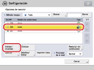 Seleccione la condición de reenvío guardada → pulse [Validar/Invalidar] para establecer la condición de reenvío a 'On'.