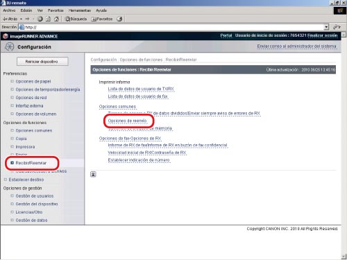 Acceda a la IU remota → seleccione [Configuración] → [Recepción/Reenvío] → [Opciones de reenvío].