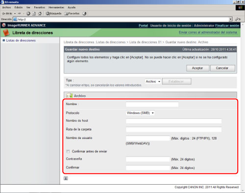 De la lista desplegable <Tipo>, seleccione [Archivo] → especifique la información para cada elemento de la pantalla de guardar destinos.