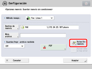 Todos los documentos de fax recibidos se enviarán ahora a la carpeta creada. Cuando finalice al reenvío de documentos de fax, se enviará el aviso fin de reenvío a la dirección especificada.