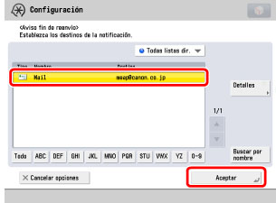 Seleccione el destino al que desee enviar un aviso fin de reenvío → pulse [Aceptar].