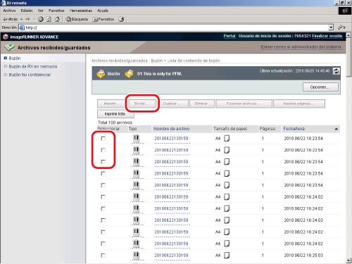 Acceda a la IU remota → haga clic en [Archivos recibidos/guardados] → [Buzón] → seleccione el número del buzón en el que esté guardado el documento.