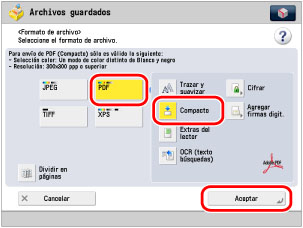 Seleccione el formato de archivo que desea enviar. Por ejemplo, seleccione [PDF] → pulse [Compacto] → [Aceptar].