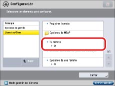 Al establecer [IU remota] en 'On', podrá abrir un puerto necesario. No obstante, se recomienda que se establezca en 'Off' si no se utiliza un puerto. Si deja el puerto abierto, un usuario no autorizado podrá acceder al equipo.