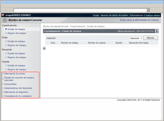 Puede utilizar la IU (interfaz de usuario) remota para comprobar el estado actual del equipo (por ejemplo, la cantidad de papel que queda en cada uno de los diversos orígenes del papel), así como para comprobar posibles errores. También puede obtener información sobre el administrador del sistema del equipo, la ubicación donde se encuentra instalado el equipo y las opciones de protocolo del mismo.