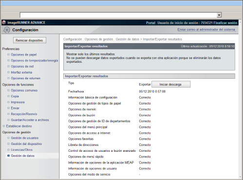 Puede comprobar los resultados de la importación/exportación más reciente pulsando [Gestión de datos] para <Opciones de gestión> → [Importar/Exportar resultados].