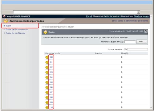 Haga clic en [Archivos recibidos/guardados] → seleccione [Buzón] → haga clic en el número del buzón deseado.