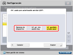 Pulse [Opciones de funciones] → [Comunes] → [Establecer método autenticac.] → [Inf. usada para autenticación servidor LDAP].