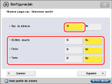 Pulse [Configuración opc. numerar juegos de copias] → [Sí] para <Opc. de números> → especifique cada opción.