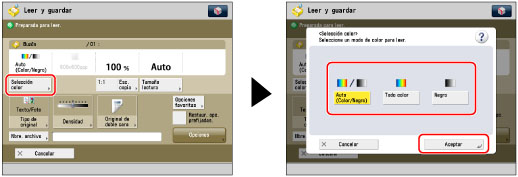 Puede guardar el modo de color que desee como opción prefijada cambiando las opciones de lectura prefijadas. (Consulte "Especificar las opciones de leer y guardar".)