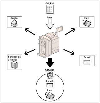 Si pulsa [Leer y enviar] en la pantalla del menú principal, aparece la pantalla de funciones básicas de Leer y enviar. La función Enviar permite leer documentos y enviarlos a destinos especificados mediante e-mail o I-fax, guardarlos en un servidor de archivos o guardarlos en un buzón para procesarlos en otro momento. Puede enviar documentos a varios destinos simultáneamente utilizando varios métodos de envío, como e-mail e I-fax.