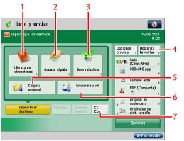 Si activa un tipo de dirección en [Limitar nuevo destino], no será posible introducir nuevos destinos de ese tipo. Seleccione un destino guardado utilizando la libreta de direcciones local, la libreta de direcciones remota o el servidor LDAP en [Libreta de direcciones], o pulsando una tecla de acceso rápido en [Acceso rápido]. (Consulte "Restringir el envío a nuevas direcciones".)