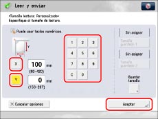 Pulse [X] y [Y] → utilice las teclas numéricas para introducir el tamaño de lectura en mm → pulse [Aceptar].