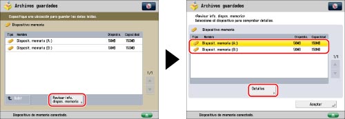 Pulse [Revisar info. dispos. memoria] → seleccione el dispositivo de memoria que desee → pulse [Detalles].