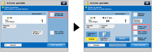 Si usa el modo Fusion. arch. e imprimir para fusionar e imprimir varios archivos, éstos se imprimen con las opciones prefijadas en Archivos guardados y no con las opciones individuales de los respectivos archivos. No obstante, las opciones de cada archivo no se cambian ni se eliminan, y permanecen igual que cuando se creó el archivo.