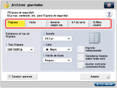 El texto que introduzca en [Person.] no se guarda automáticamente. Si desea guardar la filigrana de seguridad recién creada para seleccionarla cuando lo necesite, pulse [Guardar] → introduzca el texto que vaya a guardar.