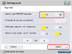 Pulse [Seguridad] → seleccione [Sí] para <Mostrar pág HTTPS/HTTP mezcladas> → pulse [Aceptar].