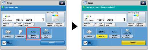Puede crear accesos directos a las opciones utilizadas con frecuencia en [Opciones]. También puede crear accesos directos a [Opciones favoritas]. Para información acerca de opciones favoritas, consulte "Guardar, recuperar y eliminar opciones favoritas (Opciones favoritas)". Estos accesos directos aparecerán después en las pantallas de funciones básicas.