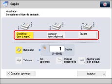 Si no se establece [Acabado], las hojas se imprimen del mismo modo que cuando se establece [Agrupar (por páginas)]. Si está activada la función [Autoclasificar], se establecerá automáticamente el modo Clasificar o el modo Clasificar y desplazar al poner los originales en el alimentador. (Consulte "Activar la clasificación automática".) Si pulsa