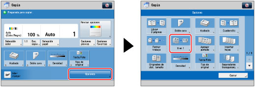 Este modo le permite imprimir varios originales leídos u originales a doble cara disponiéndolos en una sola hoja de papel. Puede seleccionar 2, 4 u 8 originales leídos para disponerlos en la página. También puede establecer copias a doble cara y cambiar el diseño y el orden de las imágenes.