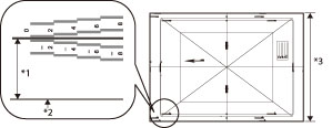 ![]() *1 12,5 mm *2 Borde izquierdo del papel 305,1 mm o más En el ejemplo de arriba, la línea central de las marcas de registro A1 y la línea trazada están alineadas. Por lo tanto, no necesitará ajustar la ubicación de la imagen. Cuando vuelva a abrir la pantalla [Ajustar posición de imagen] después de haberla cerrado pulsando [Aceptar], los valores de la pantalla volverán a [0]. Sin embargo, el valor ajustado será efectivo. Si repite los pasos, lea el valor de las marcas de registro de la nueva página de prueba e introduzca el nuevo valor.