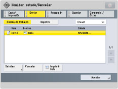Si establece [Enviar], [Estado de trabajos], [Enviar] como Pantalla prefijada (Monitor estado/Cancelar):