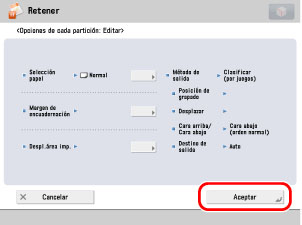 Si se seleccionan varios intervalos de páginas y las opciones de cada intervalo de páginas son diferentes, se mostrará [Variado] para [Tamaño papel de impresión], y [Cada partición] o [Aplicar opciones de cada partición] para otras opciones.