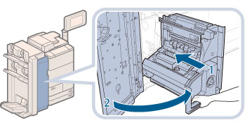 Para evitar lesiones personales, tenga cuidado con los dedos al cerrar la tapa frontal de la unidad de acabado.