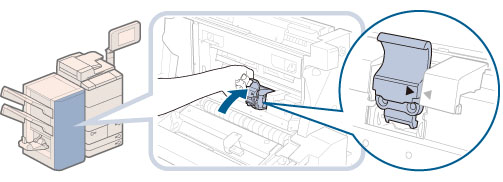 Para evitar lesiones, al empujar la unidad grapadora de cuadernillos de nuevo a su posición original tenga cuidado con los dedos.