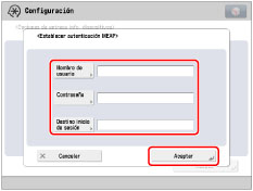 [Nombre de usuario]: Pulse [Nombre de usuario] → introduzca el nombre de usuario que desee utilizar para autenticación → pulse [Aceptar].