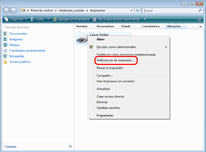 Haga clic con el botón derecho del ratón en el icono de la impresora cuyas opciones desee especificar → haga clic en [Preferencias de impresión].
