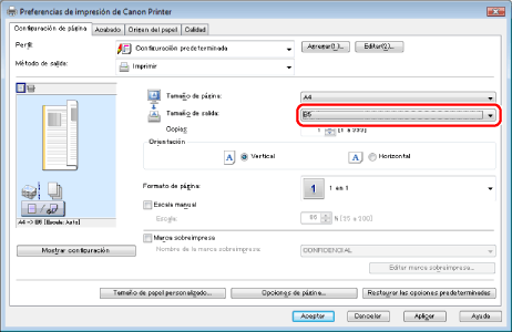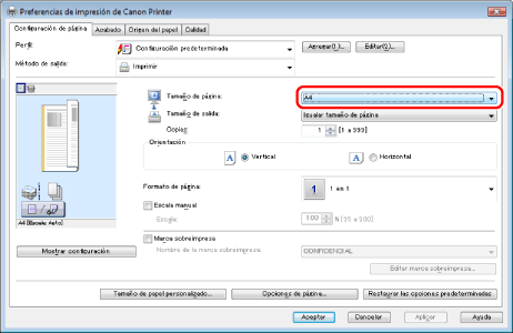 Seleccione el tamaño de página del documento que haya creado en la aplicación en [Tamaño de página].