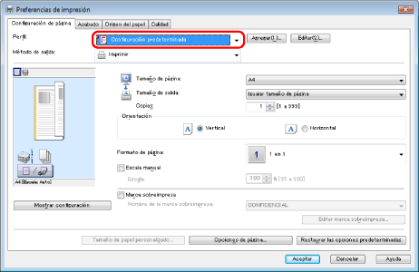 Si no puede seleccionar un perfil, muestre el cuadro de diálogo de propiedades de la impresora en [Panel de control], haga clic en la ficha [Perfil] y, a continuación, compruebe si se encuentran seleccionadas las opciones [Permitir la selección de perfiles] y [Permitir la edición de la configuración]. Para conocer las instrucciones acerca de cómo mostrar el cuadro de diálogo de propiedades de impresora, consulte " Configuración de las opciones de impresora".